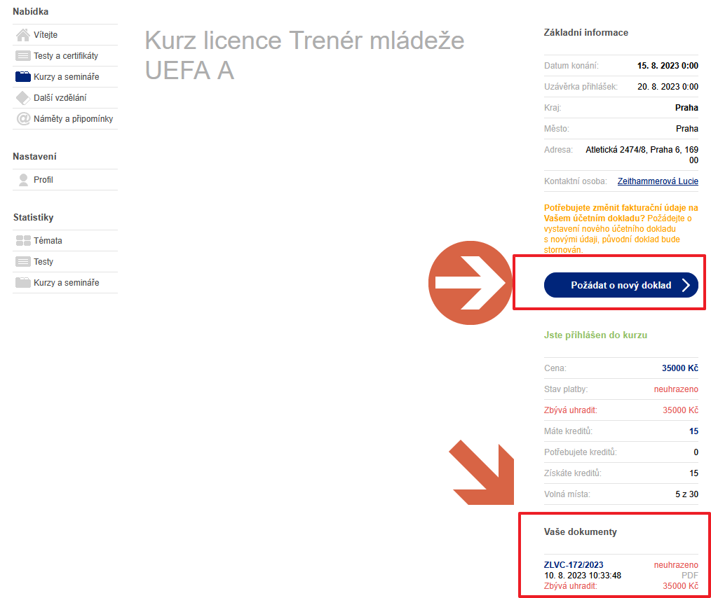 V podrobnostech kurzu využijte tlačítko Požádat o nový doklad ➲
