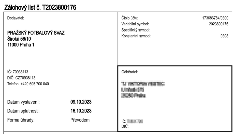 Na Vašem účetním dokladu (zálohovém listu či faktuře) je uveden jiný dodavatel než Fotbalová asociace ČR (například Pražský fotbalový svaz).