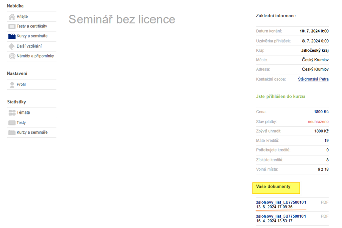 Po úspěšném přihlášení do kurzu budete mít nový doklad k dispozici ke stažení v detailu kurzu - Vaše dokumenty(3).